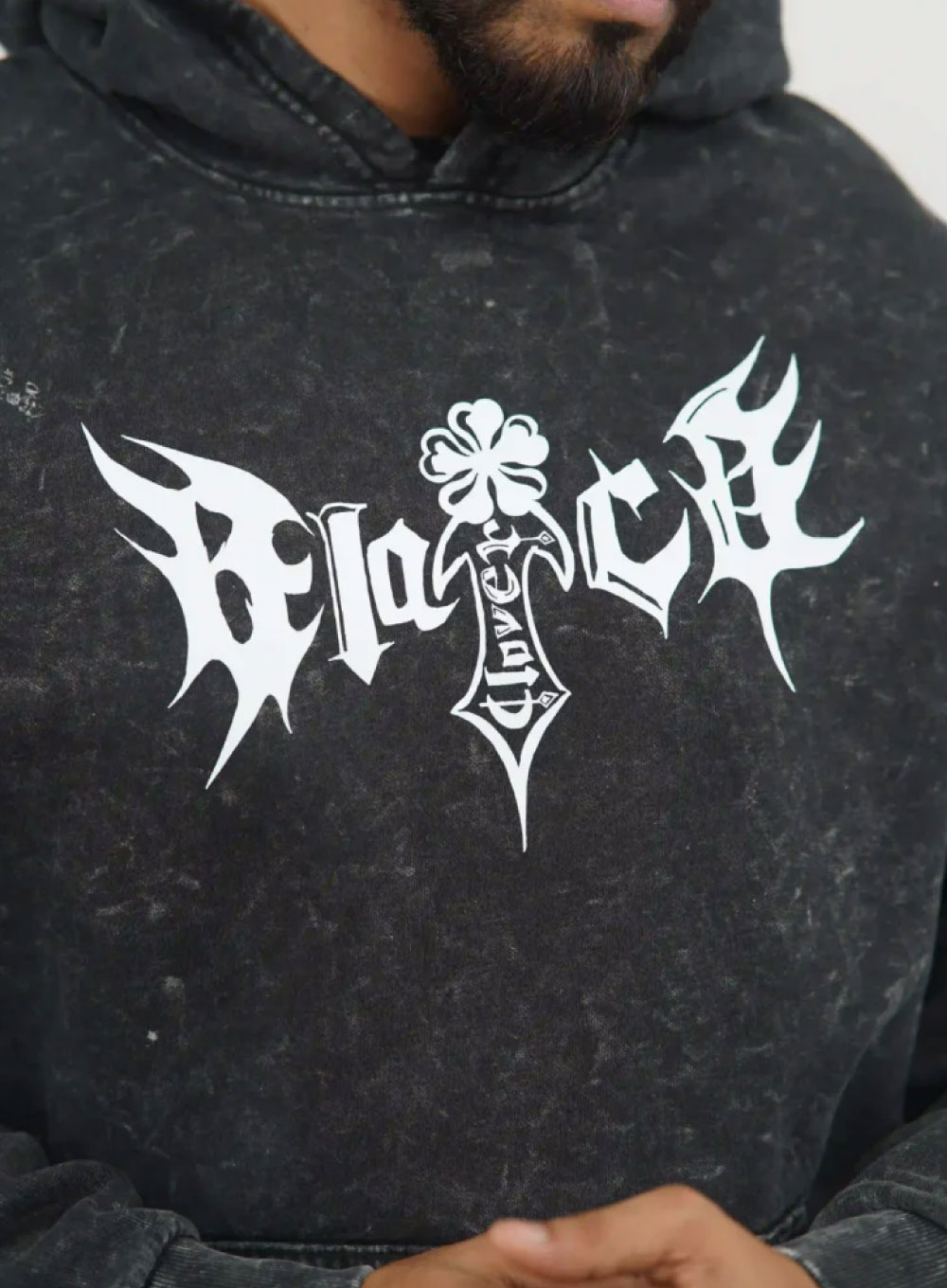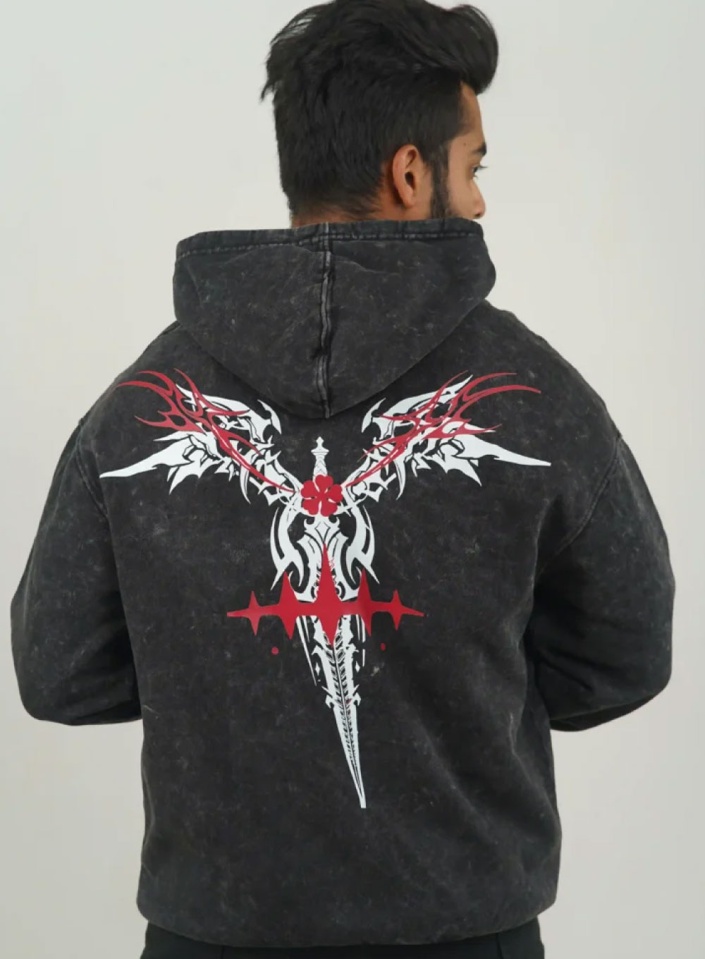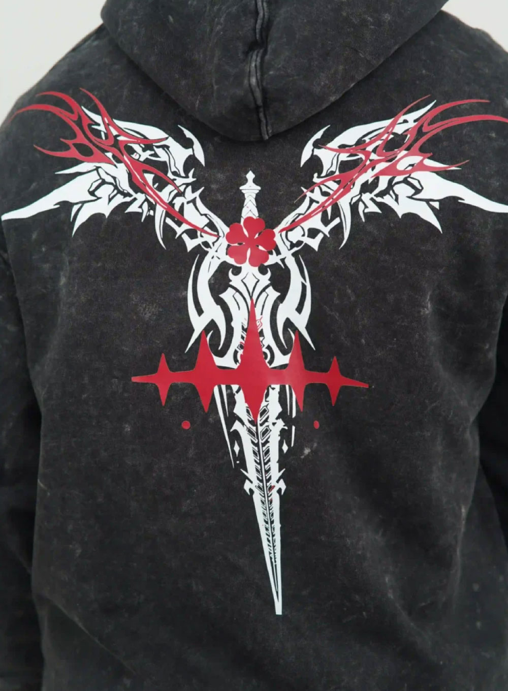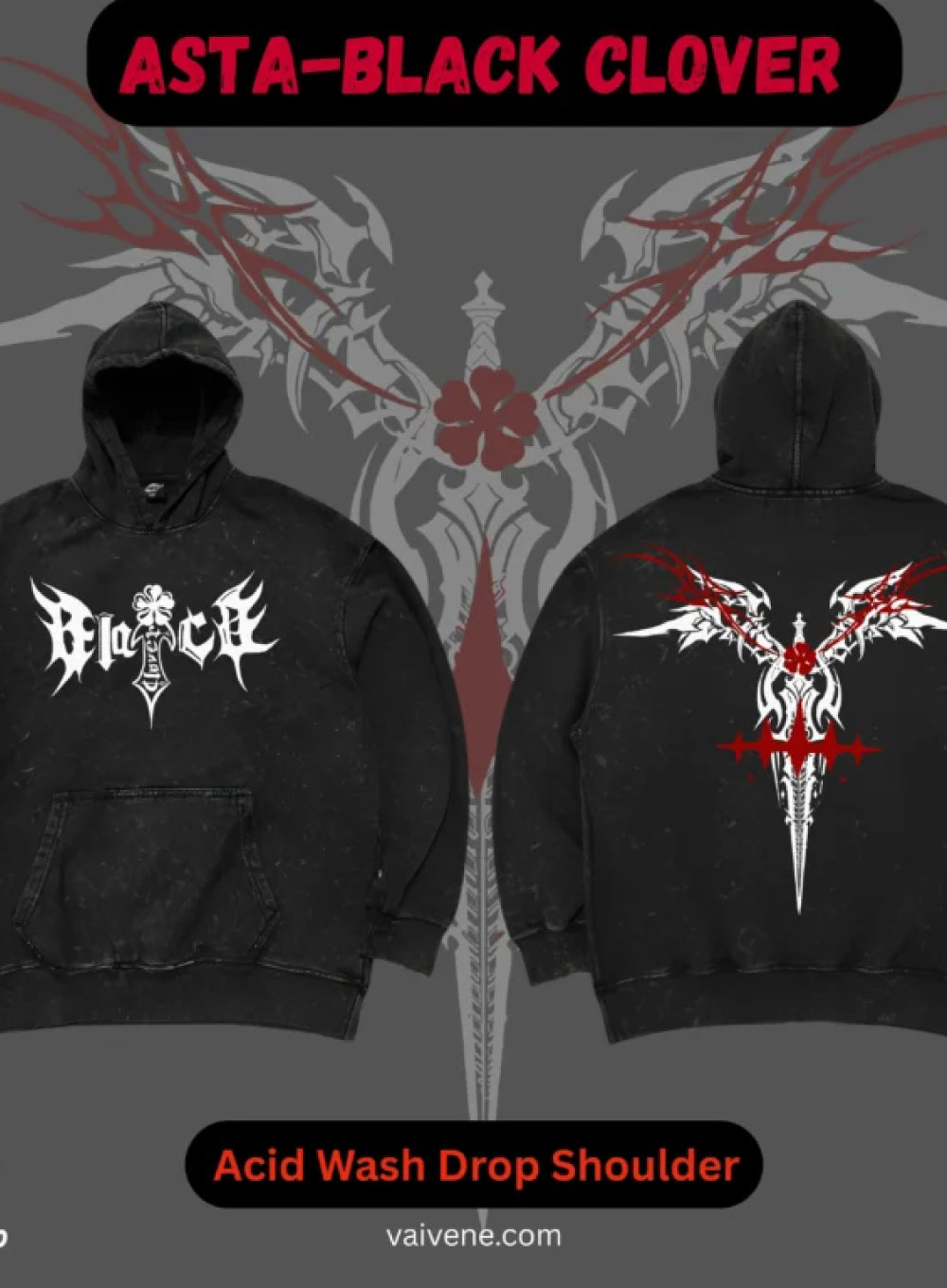 Made with knitting dyed acid-wash fleece fabric, giving each hoodie a unique washed texture and deep, vintage tone that symbolizes Asta’s relentless battles and evolution.
