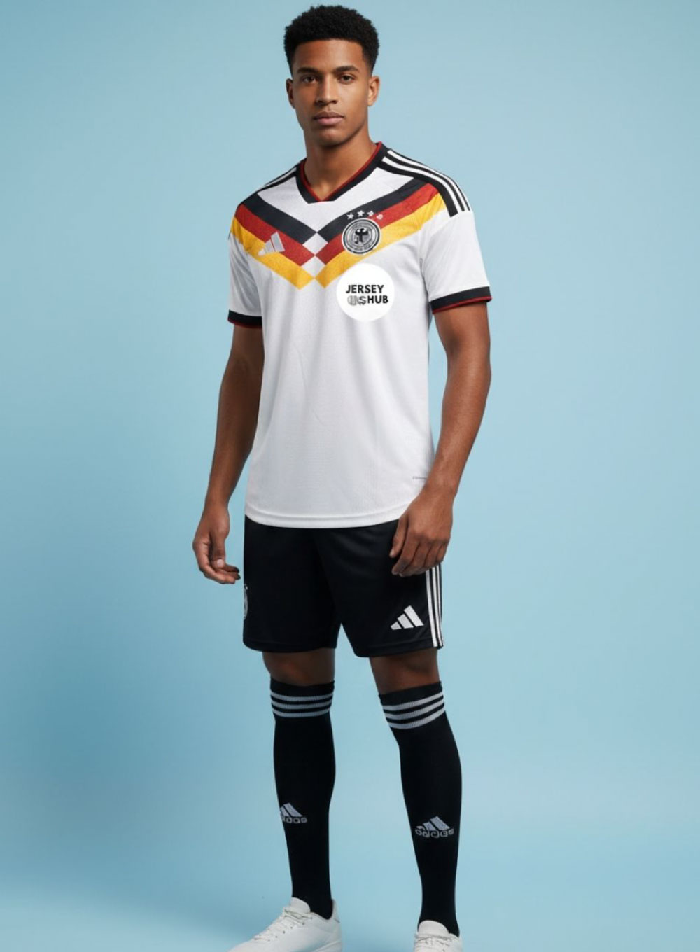 A white Adidas Germany national football team jersey featuring a bold, geometric chest graphic in the colors of the German flag.
