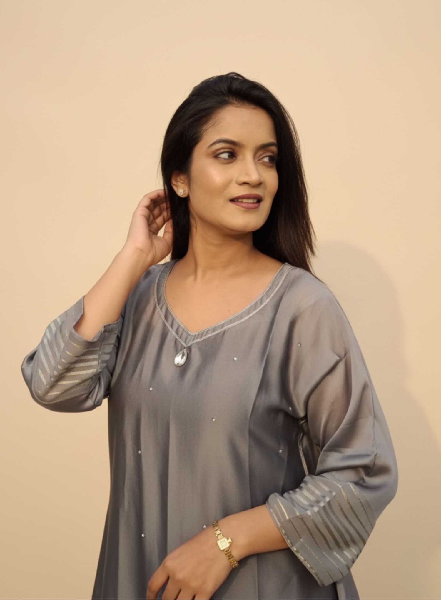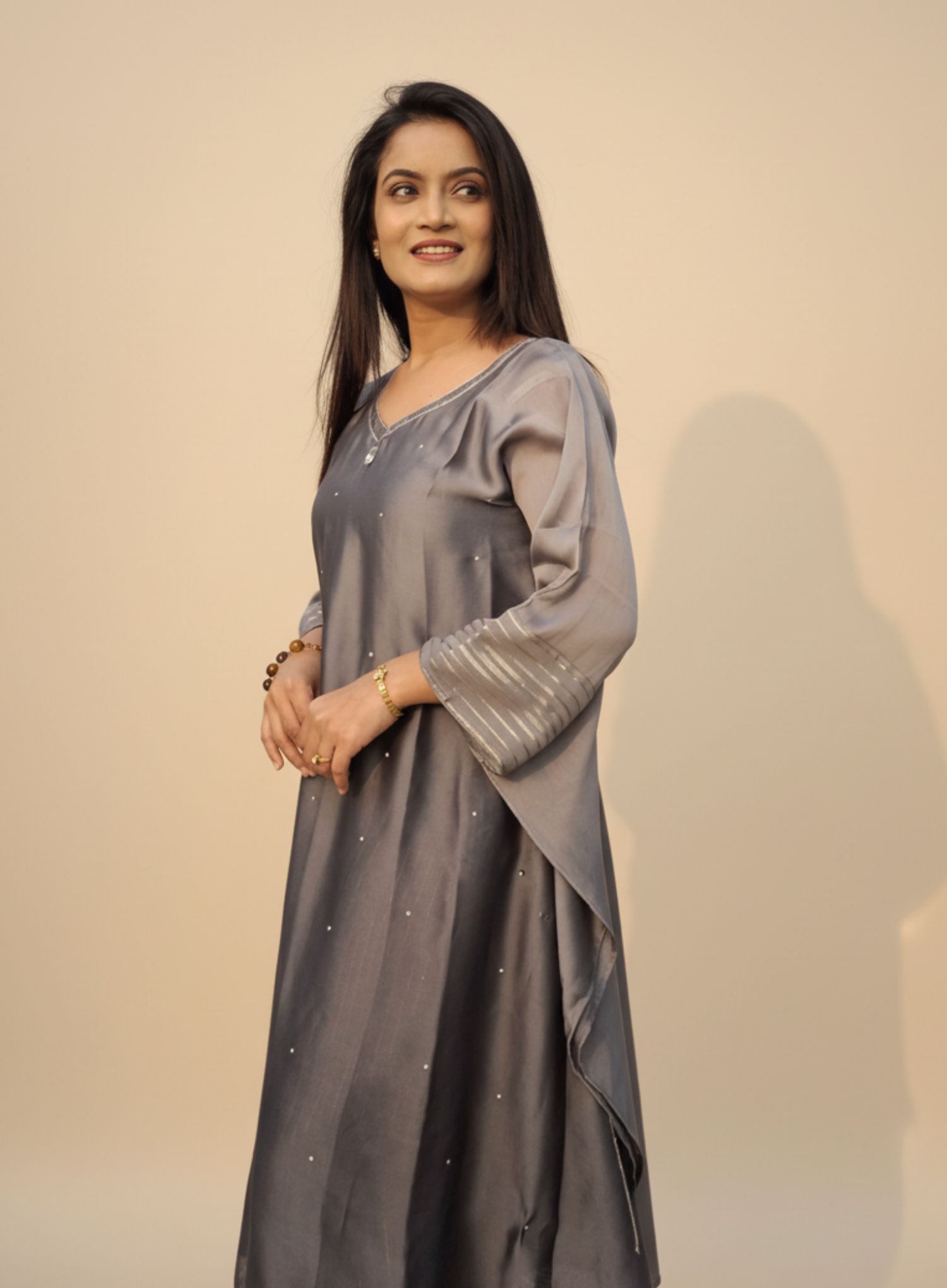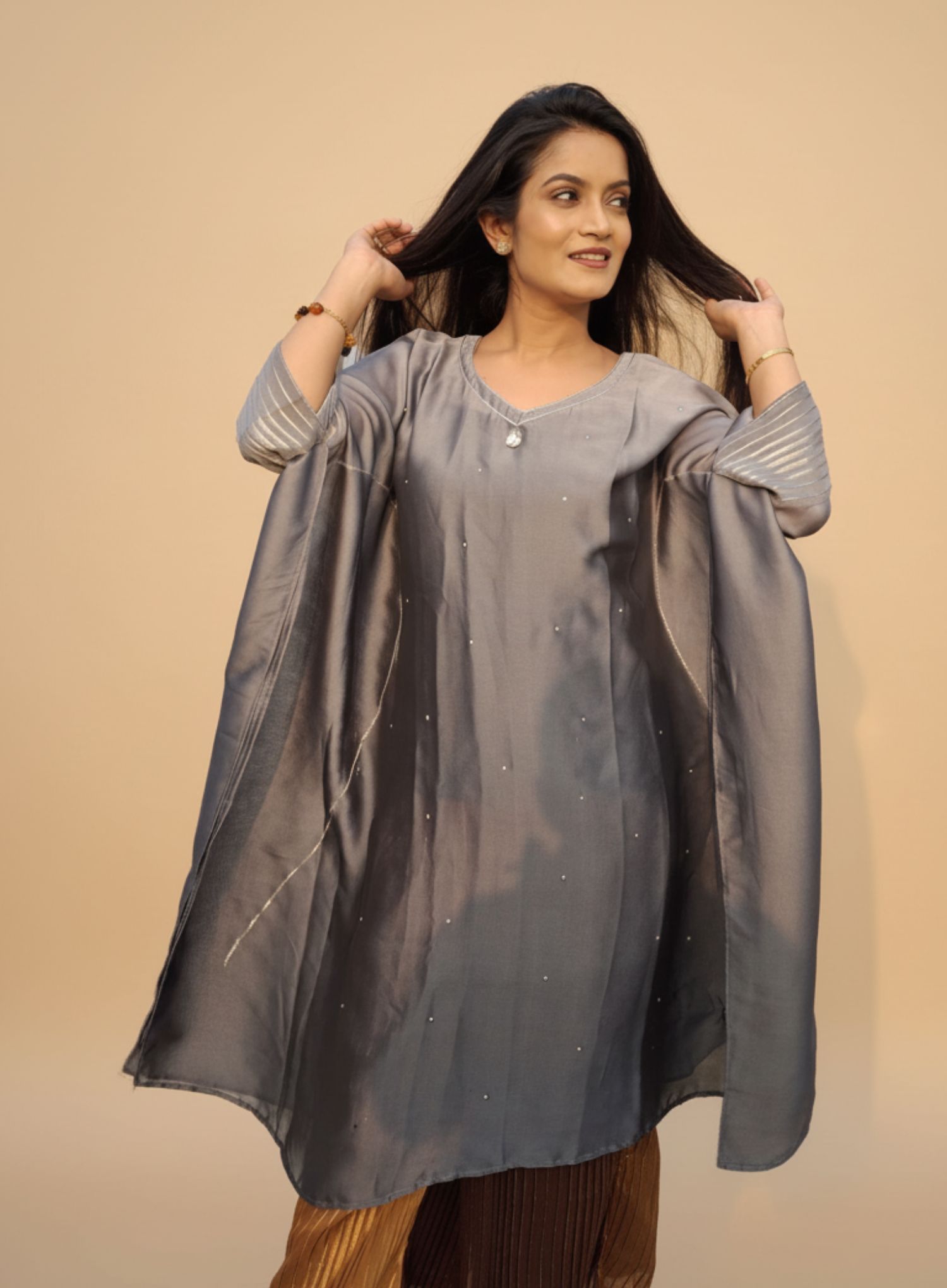 Grace meets comfort with the Ash Grey Kaftan, perfect for effortless elegance. Whether for casual gatherings or special occasions, its flowy design keeps you stylish and relaxed.