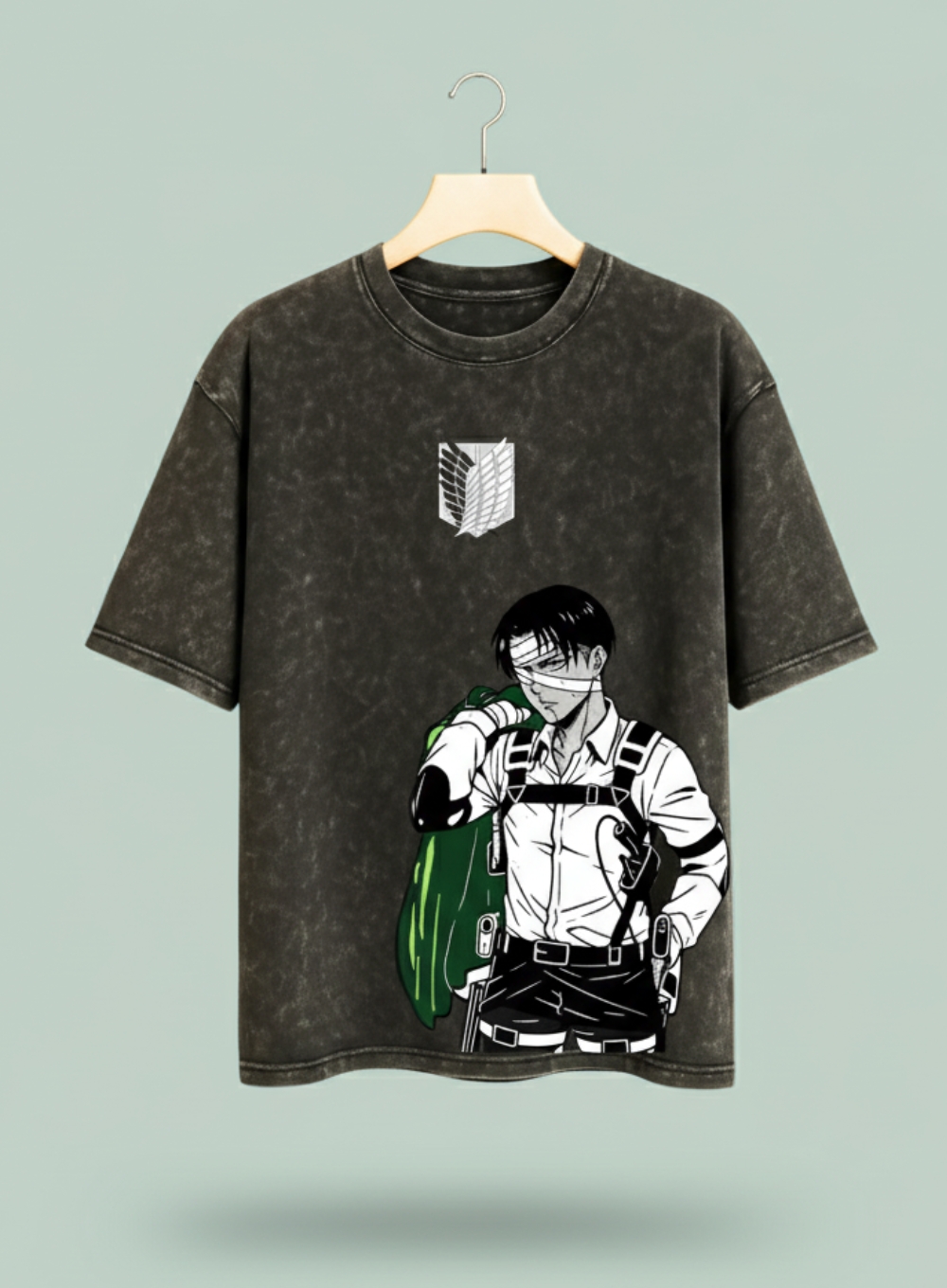 Anime-Inspired Design: Featuring Levi Ackerman, humanity’s strongest soldier from Attack on Titan, captured in a bold and minimal acid wash style that reflects his fearless attitude and clean precision. The intricate print detailing adds a powerful edge that true fans will recognize instantly.