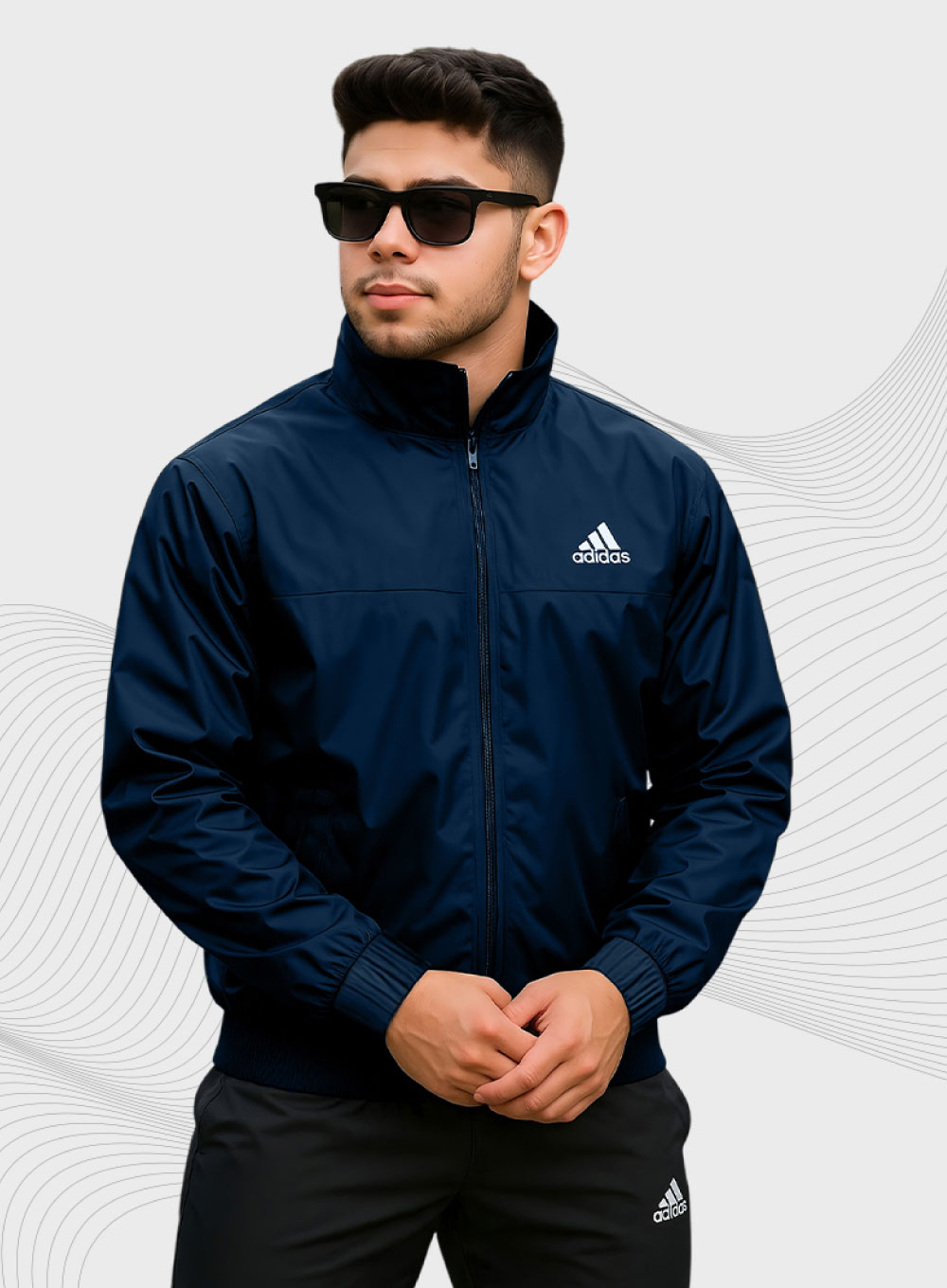 A classic Adidas hooded windbreaker in navy blue, offering lightweight comfort and a timeless everyday look.