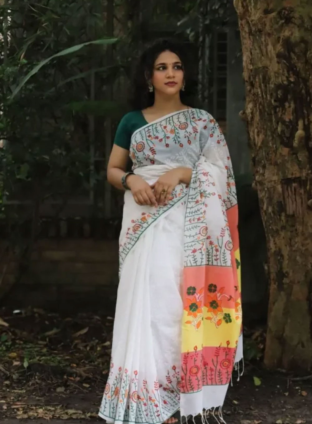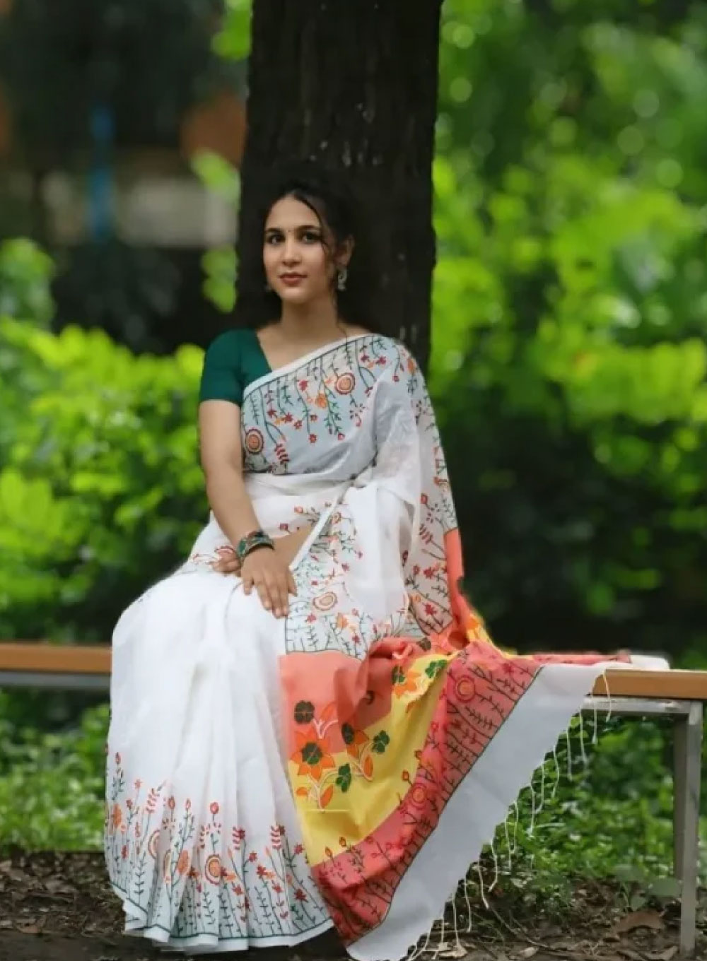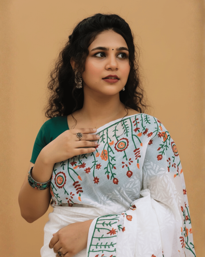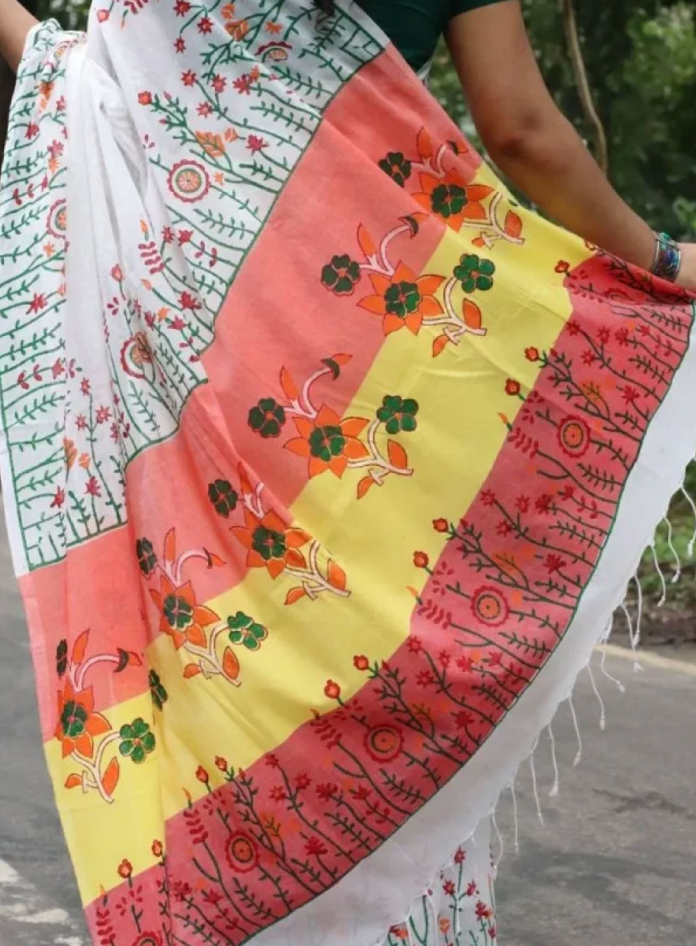 Premium pure cotton saree with block print in white and multi-colour; includes matching blouse piece.