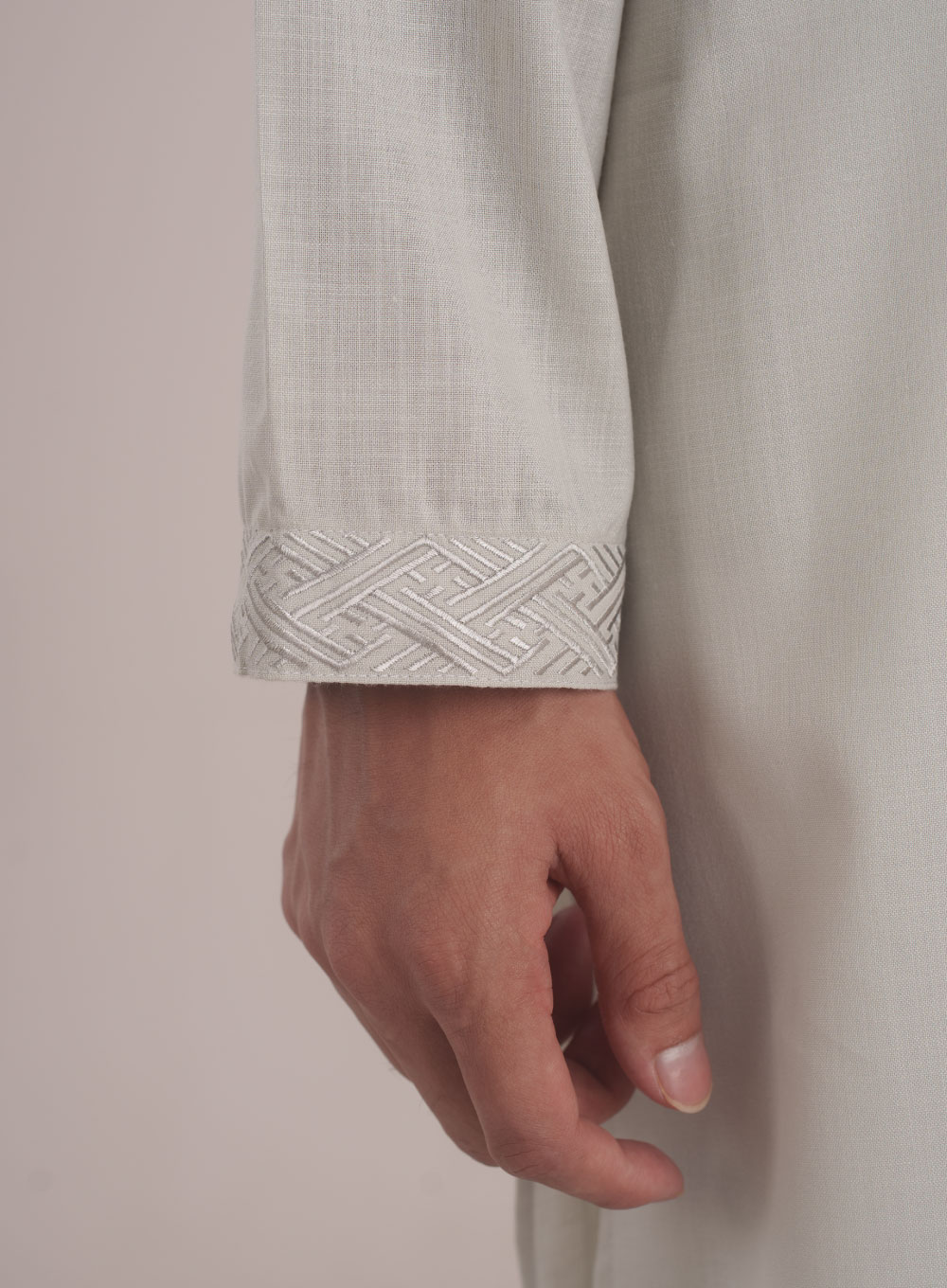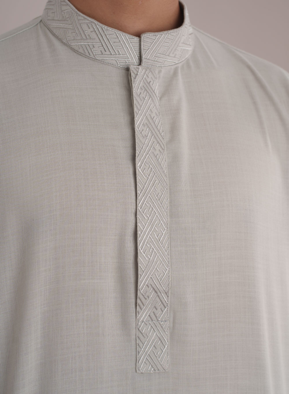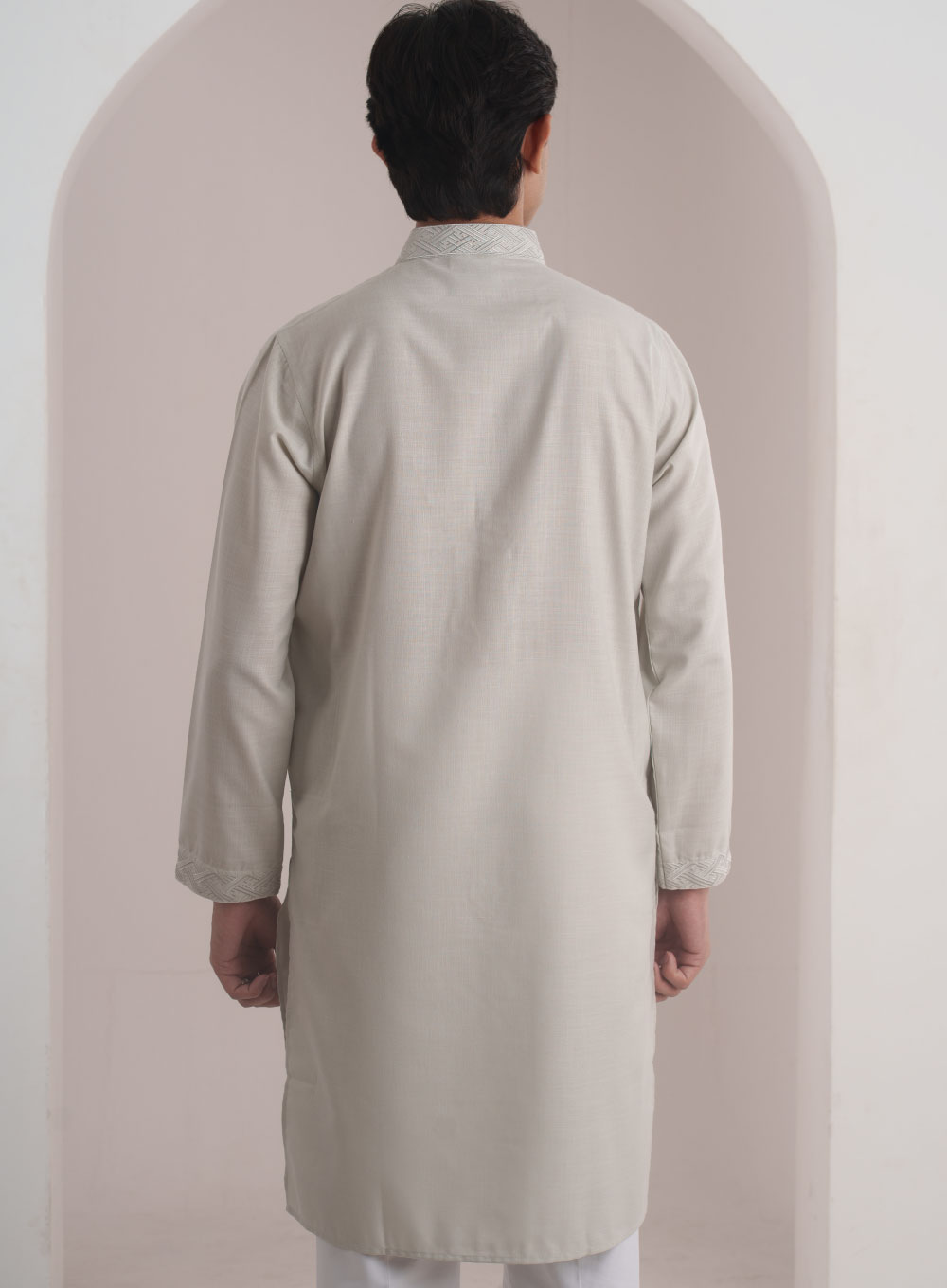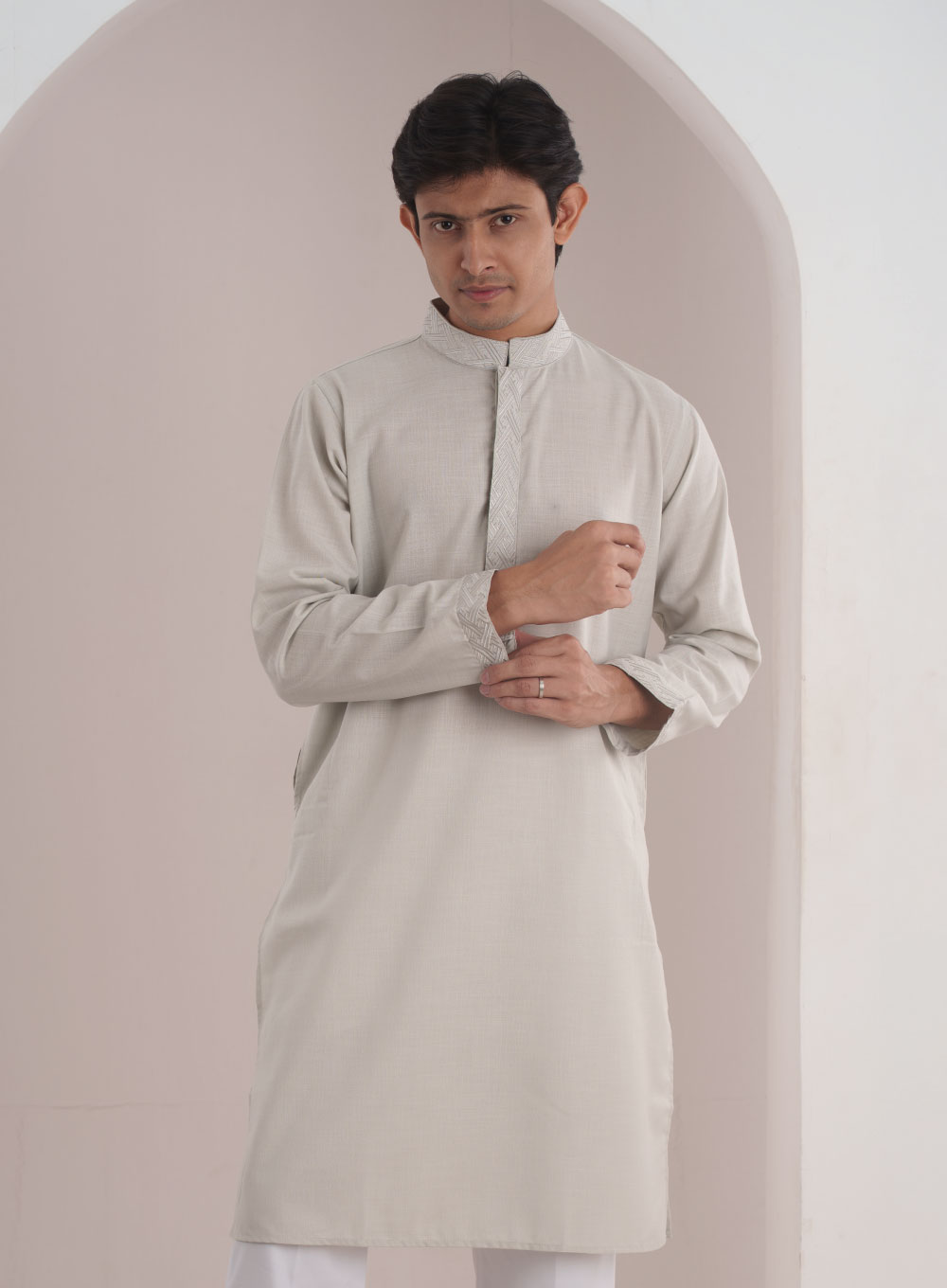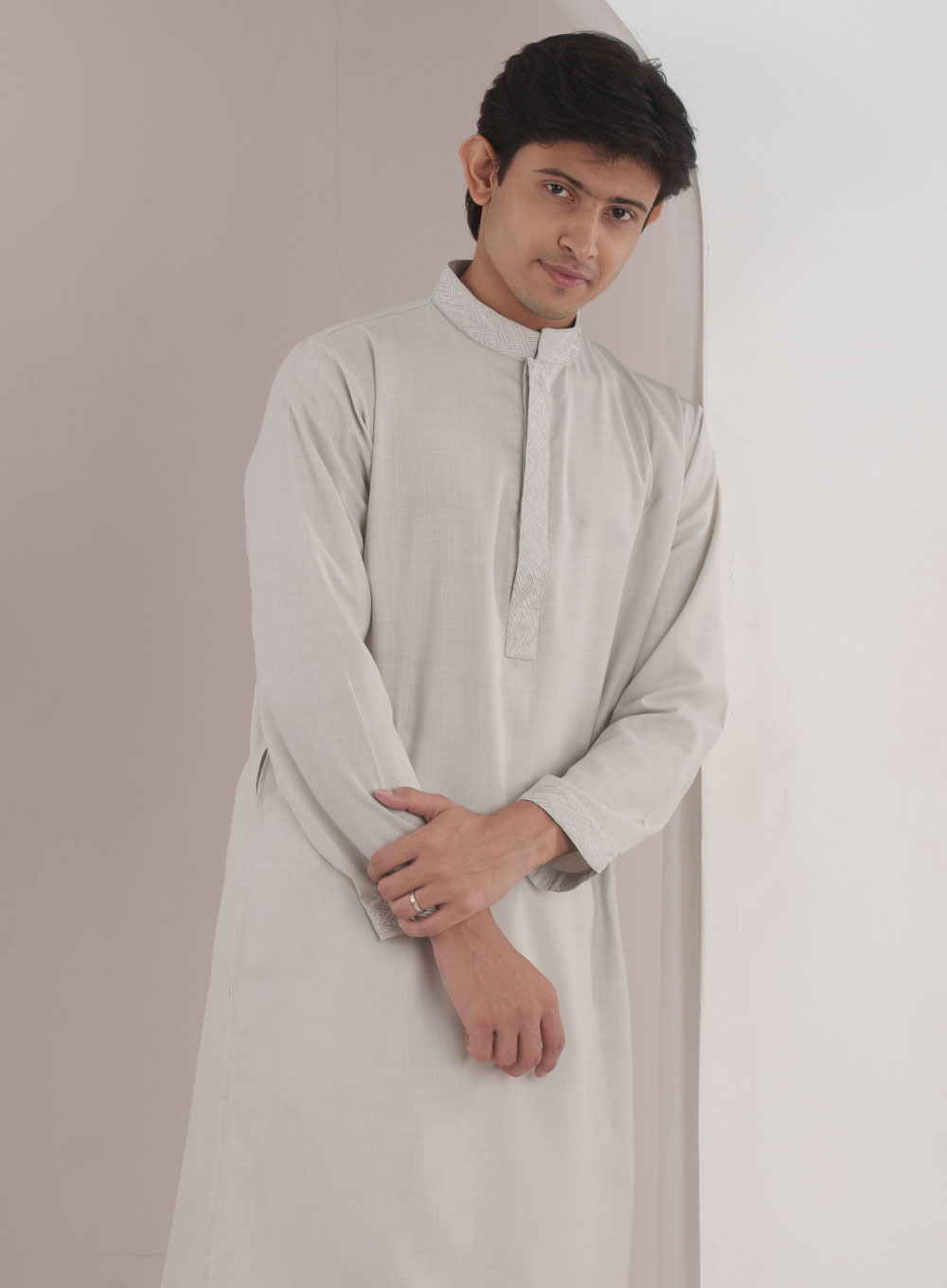 Embrace timeless grace with the White Ash Elegance Panjabi from Bazeline. Crafted from premium Indian fabric, this piece offers a refined look with a modern cut and breathable comfort. Perfect for both festive and formal occasions, its subtle white ash hue radiates understated sophistication. Pair it with classic pajama or trousers for a complete look.